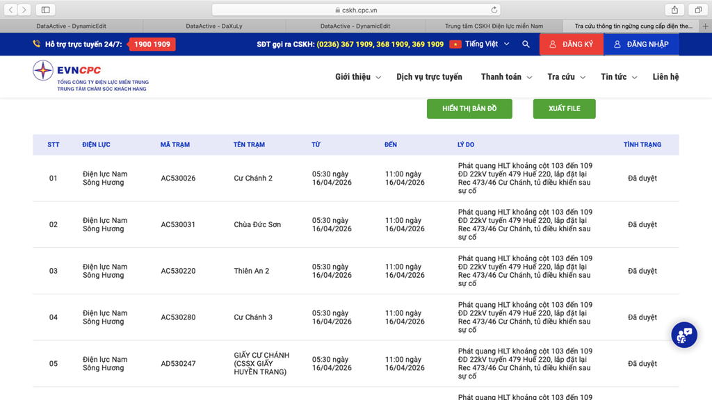 | 1 | Điện lực Nam Sông Hương | AC530026 | Cư Chánh 2 | 05:30 16/04/2026 | 11:00 16/04/2026 | Phát quang HLT khoảng cột 103 đến 109 ĐD 22kV tuyến 479 Huế 220, lắp đặt lại Rec 473/46 Cư Chánh, tủ điều khiển sau sự cố | Đã duyệt |