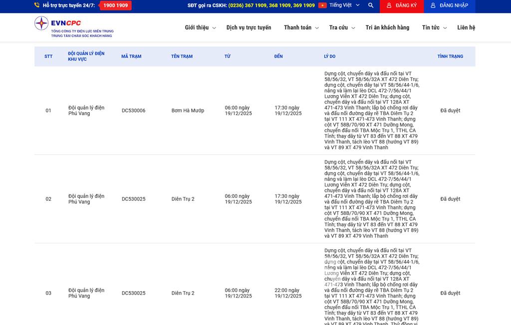 | 4 | Đội quản lý điện Phú Vang | DC530026 | Dưỡng Mong A | 06:00 19/12/2025 | 17:30 19/12/2025 | Dựng cột, chuyển dây và đấu nối tại VT 58/56/32, VT 58/56/32A XT 472 Diên Trụ; dựng cột, chuyển dây tại VT 58/56/44-1/6, nâng và làm lại lèo DCL 472-7/56/44/1 Lương Viễn XT 472 Diên Trụ; dựng cột, chuyển dây và đấu nối tại VT 128A XT 471-473 Vinh Thanh; lắp bộ chống rơi dây và đấu nối đường dây rẽ TBA Diêm Tụ 2 tại VT 111 XT 471-473 Vinh Thanh; dựng cột VT 58B/70/90 XT 471 Dưỡng Mong, chuyển đấu nối TBA Mộc Trụ 1, TTHL CA Tỉnh; thay dây từ VT 83 đến VT 88 XT 479 Vinh Thanh, tách lèo VT 88 (hướng VT 89) và VT 89 XT 479 Vinh Thanh | Đã duyệt |