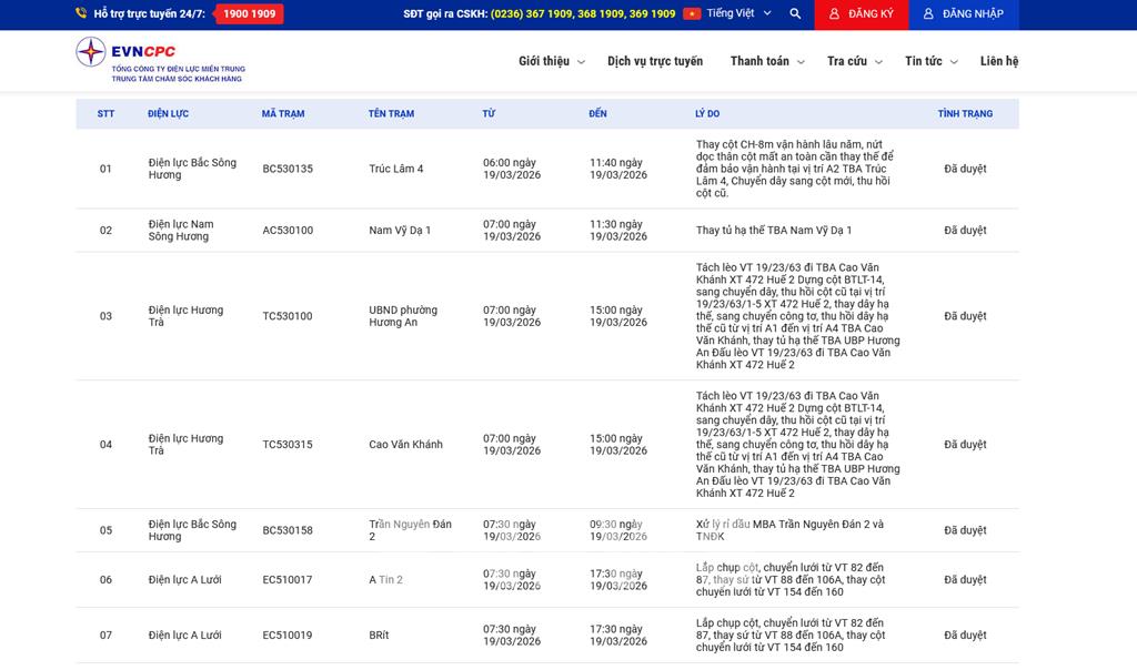 | 2 | Điện lực Nam Sông Hương | AC530100 | Nam Vỹ Dạ 1 | 07:00 19/03/2026 | 11:30 19/03/2026 | Thay tủ hạ thế TBA Nam Vỹ Dạ 1 | Đã duyệt |
