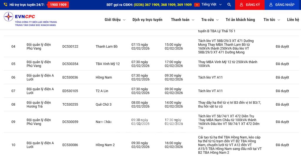 Lịch cắt điện thành phố Huế ngày mai 2/2 trên website của EVNCPC cập nhật ngày 1/2. Ảnh: Bnews/vnanet.vn