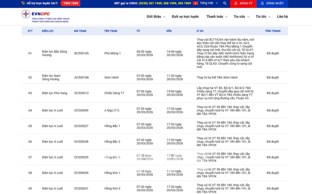 | 2 | Điện lực Nam Sông Hương | AC530188 | Xóm Hành | 07:00 20/03/2026 | 11:30 20/03/2026 | Thay tủ hạ thế TBA Xóm Hành | Đã duyệt |