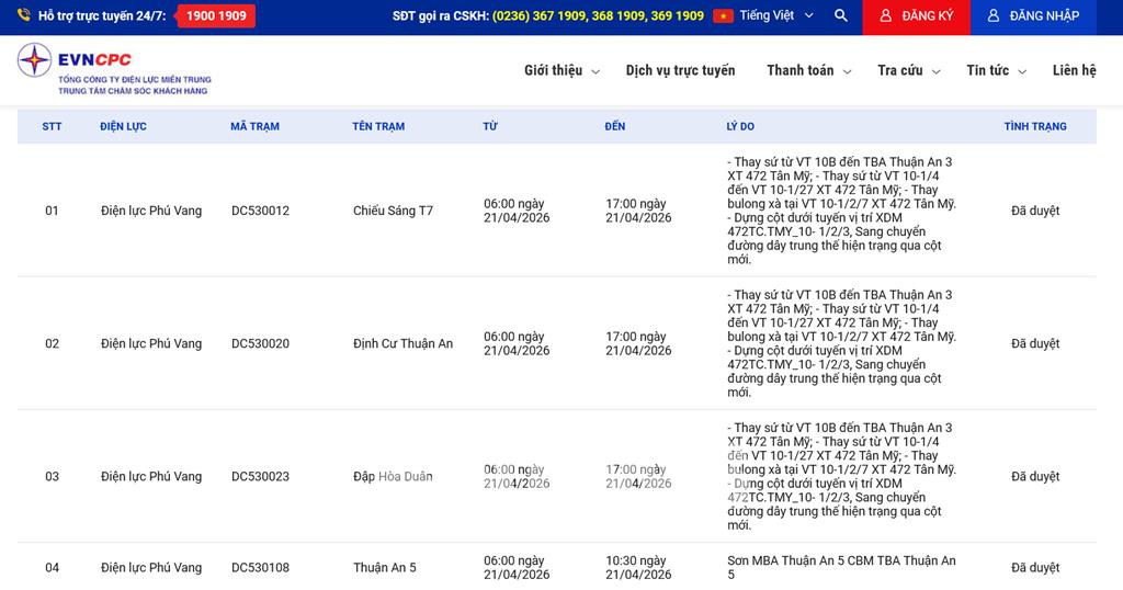 | 4 | Điện lực Phú Vang | DC530108 | Thuận An 5 | 06:00 21/04/2026 | 10:30 21/04/2026 | Sơn MBA Thuận An 5CBM TBA Thuận An 5 | Đã duyệt |