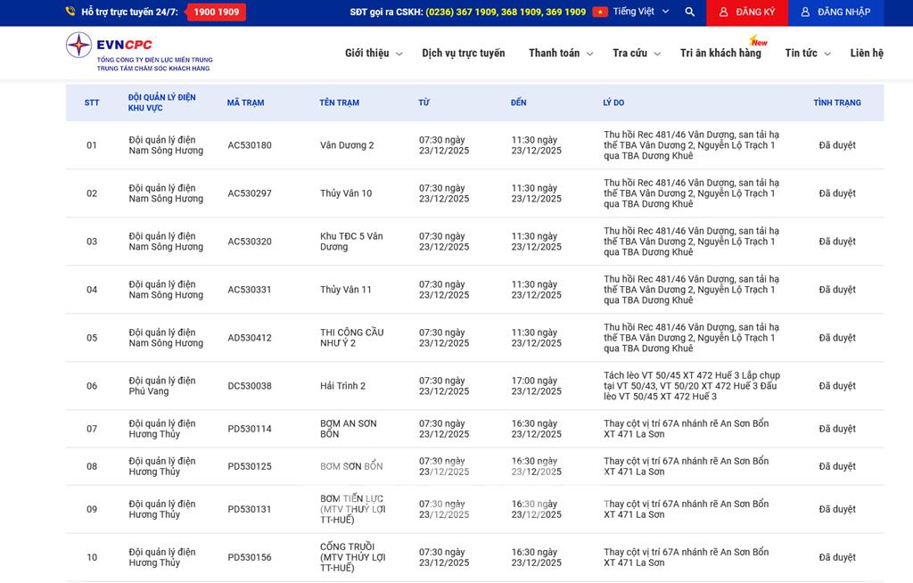 | 10 | Đội quản lý điện Hương Thủy | PD530156 | CỐNG TRUỒI (MTV THỦY LỢI TT-HUẾ) | 07:30 23/12/2025 | 16:30 23/12/2025 | Thay cột vị trí 67A nhánh rẽ An Sơn Bổn XT 471 La Sơn | Đã duyệt |