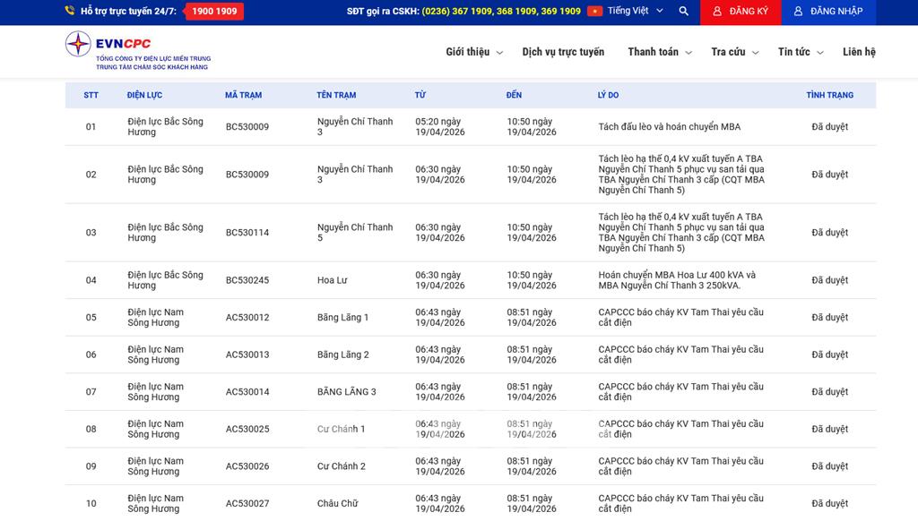 | 8 | Điện lực Nam Sông Hương | AC530025 | Cư Chánh 1 | 06:43 19/04/2026 | 08:51 19/04/2026 | CAPCCC báo cháy KV Tam Thai yêu cầu cắt điện | Đã duyệt |