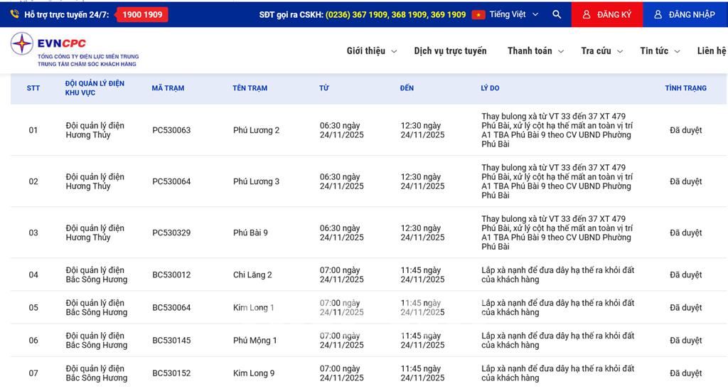 | 7 | Đội quản lý điện Bắc Sông Hương | BC530152 | Kim Long 9 | 07:00 24/11/2025 | 11:45 24/11/2025 | Lắp xà nạnh để đưa dây hạ thế ra khỏi đất của khách hàng | Đã duyệt |