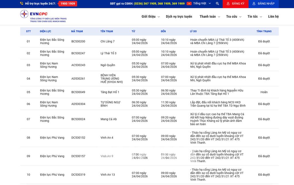 | 3 | Điện lực Nam Sông Hương | AC530243 | Ngô Quyền | 05:30 24/04/2026 | 07:00 24/04/2026 | Xử lý phát nhiệt đầu cực hạ thế MBA Khoa Nhi, Ngô Quyền | Đã duyệt |