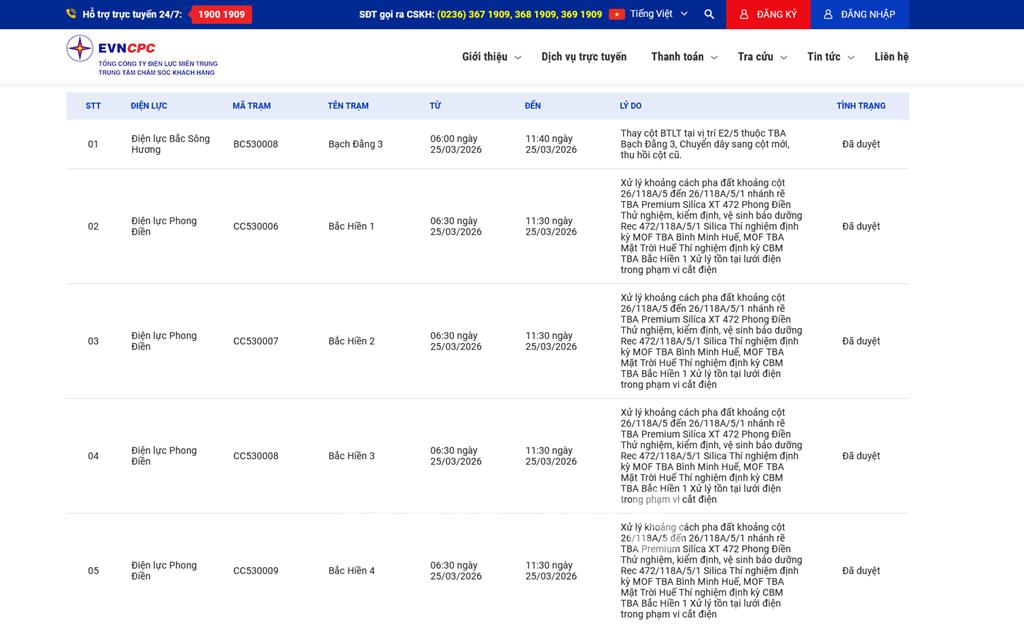 | 2 | Điện lực Phong Điền | CC530006 | Bắc Hiền 1 | 06:30 25/03/2026 | 11:30 25/03/2026 | Xử lý khoảng cách pha đất khoảng cột 26/118A/5 đến 26/118A/5/1 nhánh rẽ TBA Premium Silíca XT 472 Phong ĐiềnThử nghiệm, kiểm định, vệ sinh bảo dưỡng Rec 472/118A/5/1 SilicaThí nghiệm định kỳ MOF TBA Bình Minh Huế, MOF TBA Mặt Trời HuếThí nghiệm định kỳ CBM TBA Bắc Hiền 1Xử lý tồn tại lưới điện trong phạm vi cắt điện | Đã duyệt |