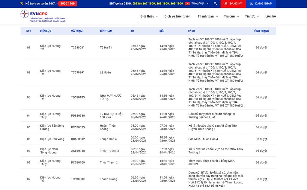 | 1 | Điện lực Hương Trà | TC530081 | Tứ Hạ T1 | 05:45 25/04/2026 | 14:30 25/04/2026 | Tách lèo VT 108 XT 480 Huế 2Lắp chụp cột tại các vị trí 100/1, 100/3, 100/4, 100/5-1/1 thuộc XT 480 Huế 2, CBM Rec 480/88 Tứ HạXử lý tồn tại nhánh rẽ TBA T1 Tứ Hạ, thay TI đo đếm định kỳ TBA NMN Tứ HạĐấu lèo VT 108 XT 480 Huế 2 | Đã duyệt |