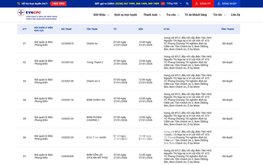 | 7 | Đội quản lý điện Phong Điền | CD830208 | BƠM CỒN LÔI (HTX NN MỸ PHÚ) | 07:00 27/01/2026 | 12:00 27/01/2026 | Dựng cột BTLT, đấu nối cấp điện TBA HKD Nguyễn Thị Nga tại vị trí cột 45A XT 473 TC Phong ChươngThí nghiệm định kỳ CBM các TBA Chánh An 2, Bơm ÔĐồng Bèn, Bơm Chánh An, Ô Sa Nhơn | Đã duyệt |