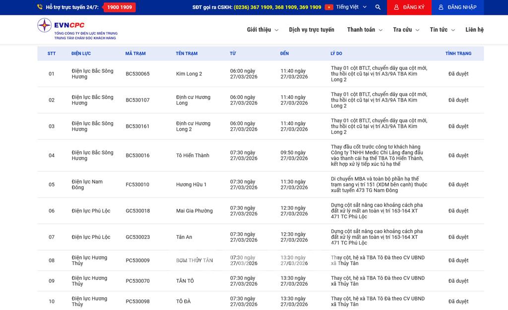 | 10 | Điện lực Hương Thủy | PC530098 | TÔ ĐÀ | 07:30 27/03/2026 | 13:30 27/03/2026 | Thay cột, hệ xà TBA Tô Đà theo CV UBND xã Thủy Tân | Đã duyệt |