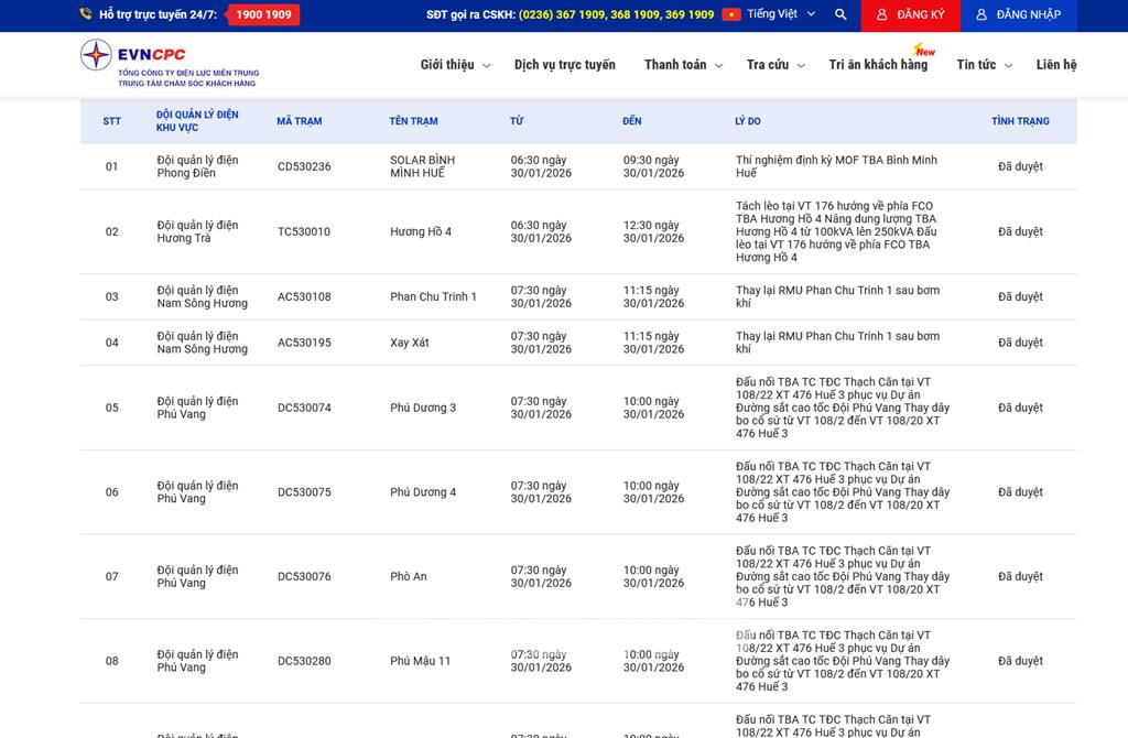 | 8 | Đội quản lý điện Phú Vang | DC530280 | Phú Mậu 11 | 07:30 30/01/2026 | 10:00 30/01/2026 | Đấu nối TBA TC TĐC Thạch Căn tại VT 108/22 XT 476 Huế 3 phục vụ Dự án Đường sắt cao tốc Đội Phú Vang Thay dây bo cổ sứ từ VT 108/2 đến VT 108/20 XT 476 Huế 3 | Đã duyệt |