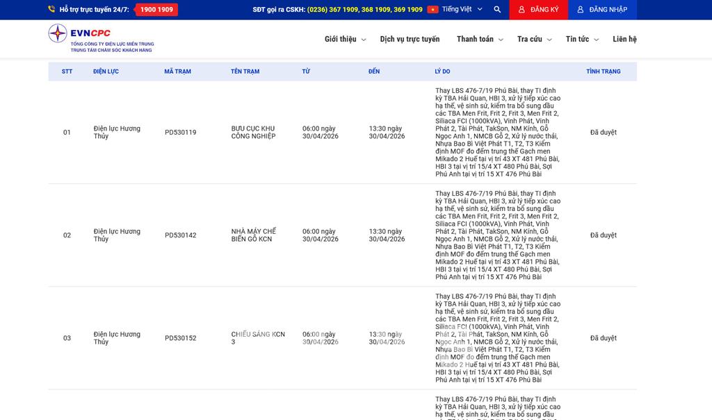 | 8 | Điện lực Hương Thủy | PD530177 | CTCP DƯỢC MEDIPHARCO | 06:00 30/04/2026 | 13:30 30/04/2026 | Thay LBS 476-7/19 Phú Bài, thay TI định kỳ TBA Hải Quan, HBI 3, xử lý tiếp xúc cao hạ thế, vệ sinh sứ, kiểm tra bổ sung dầu các TBA Men Frit, Frit 2, Frit 3, Men Frit 2, Siliaca FCI (1000kVA), Vinh Phát, Vinh Phát 2, Tài Phát, TakSon, NM Kính, Gỗ Ngọc Anh 1, NMCB Gỗ 2, Xử lý nước thải, Nhựa Bao Bì Việt Phát T1, T2, T3Kiểm định MOF đo đếm trung thế Gạch men Mikado 2 Huế tại vị trí 43 XT 481 Phú Bài, HBI 3 tại vị trí 15/4 XT 480 Phú Bài, Sợi Phú Anh tại vị trí 15 XT 476 Phú Bài | Đã duyệt |