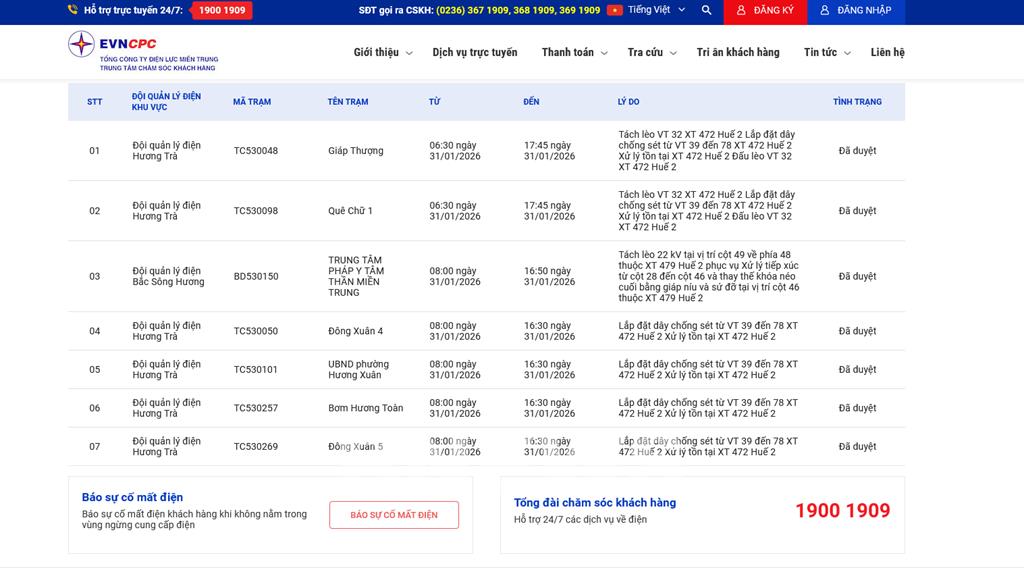 | 7 | Đội quản lý điện Hương Trà | TC530269 | Đông Xuân 5 | 08:00 31/01/2026 | 16:30 31/01/2026 | Lắp đặt dây chống sét từ VT 39 đến 78 XT 472 Huế 2Xử lý tồn tại XT 472 Huế 2 | Đã duyệt |