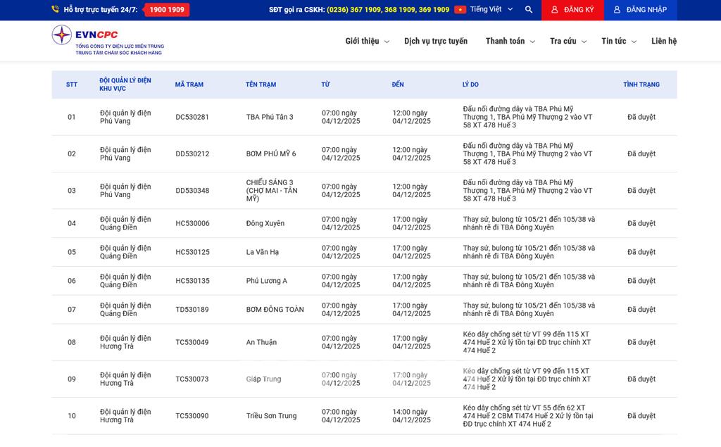 | 1 | Đội quản lý điện Phú Vang | DC530281 | TBA Phú Tân 3 | 07:00 04/12/2025 | 12:00 04/12/2025 | Đấu nối đường dây và TBA Phú Mỹ Thượng 1, TBA Phú Mỹ Thượng 2 vào VT 58 XT 478 Huế 3 | Đã duyệt |