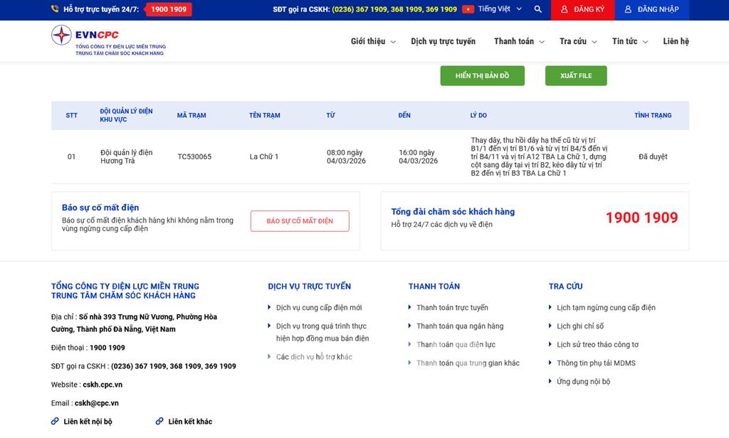 Lịch tạm ngừng cấp điện thành phố Huế ngày mai 4/3. Nguồn ảnh: Công ty Điện lực Huế
