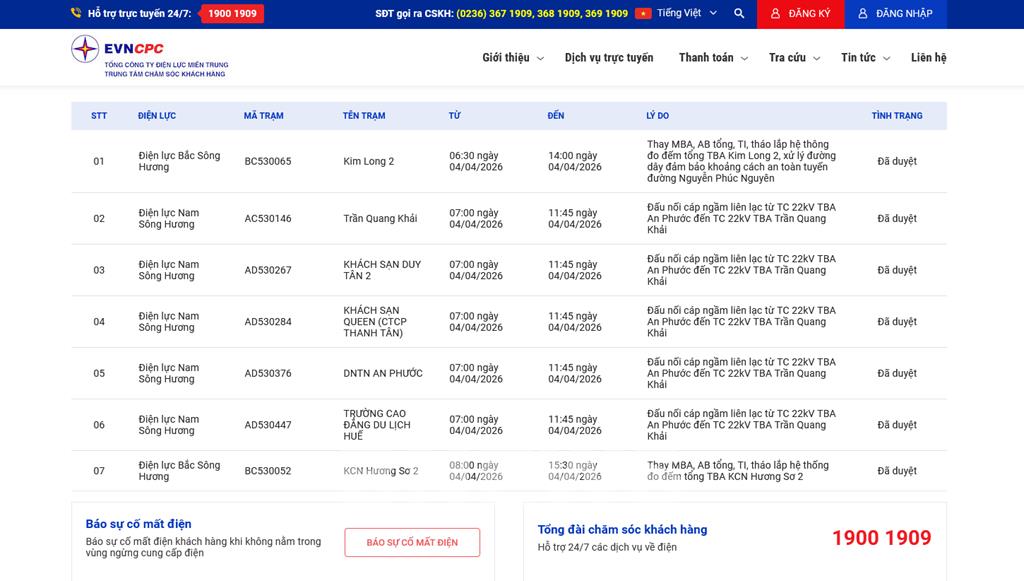| 6 | Điện lực Nam Sông Hương | AD530447 | TRƯỜNG CAO ĐẲNG DU LỊCH HUẾ | 07:00 04/04/2026 | 11:45 04/04/2026 | Đấu nối cáp ngầm liên lạc từ TC 22kV TBA An Phước đến TC 22kV TBA Trần Quang Khải | Đã duyệt |
