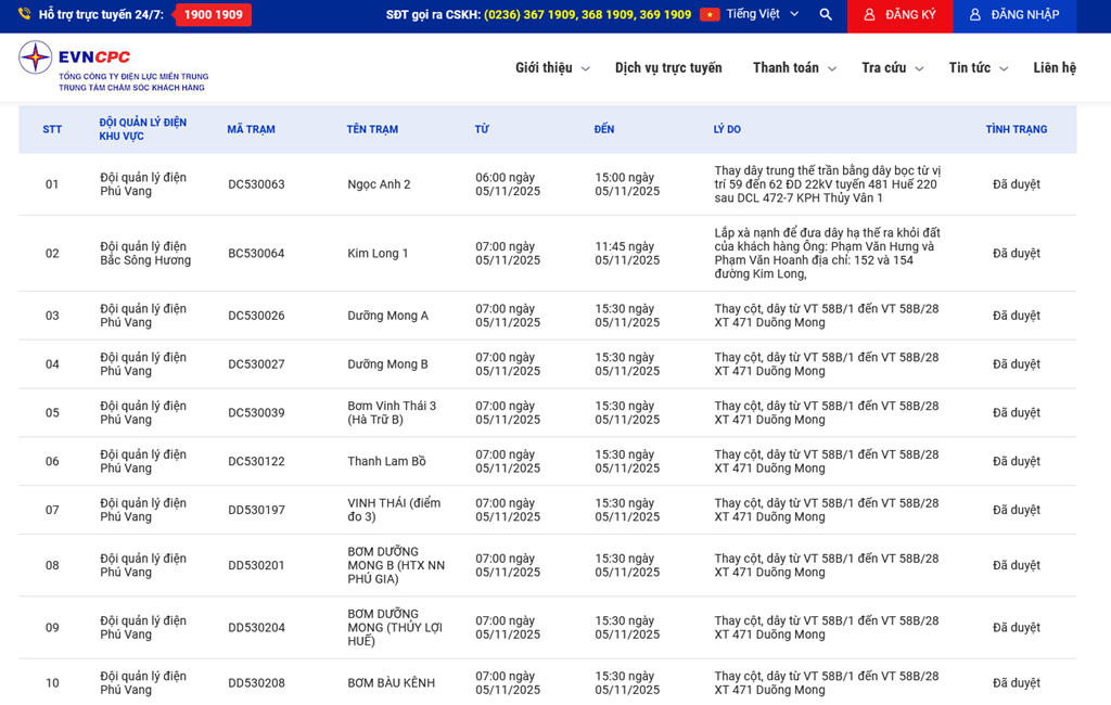 | 4 | Đội quản lý điện Phú Vang | DC530027 | Dưỡng Mong B | 07:00 05/11/2025 | 15:30 05/11/2025 | Thay cột, dây từ VT 58B/1 đến VT 58B/28 XT 471 Duõng Mong | Đã duyệt |