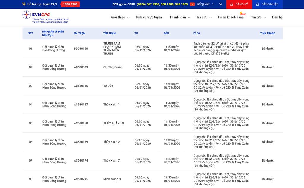 | 8 | Đội quản lý điện Nam Sông Hương | AC530295 | Minh Mạng 3 | 06:00 06/01/2026 | 16:30 06/01/2026 | Dựng cột, lắp chụp đầu cột, thay dây trung thế từ vị trí 32-2/32/16 đến 32-2/17/25 ĐD 22kV tuyến 479 Huế 220 đi Thủy Xuân (30 khoảng cột) | Đã duyệt |