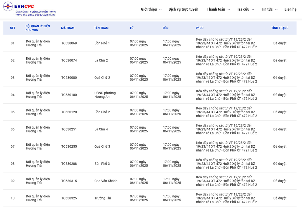 | 4 | Đội quản lý điện Hương Trà | TC530100 | UBND phường Hương An | 07:00 06/11/2025 | 17:00 06/11/2025 | Kéo dây chống sét từ VT 19/23/2 đến 19/23/44 XT 472 Huế 2Xử lý tồn tại DZ nhánh rẽ La Chữ - Bồn Phổ XT 472 Huế 2 | Đã duyệt |
