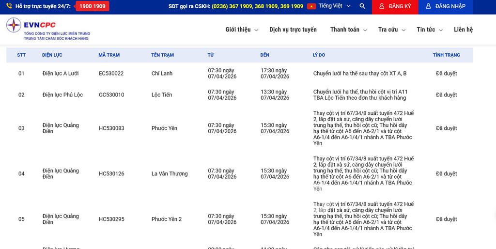 | 6 | Điện lực Hương Trà | TC530069 | Bồn Phổ 1 | 08:00 07/04/2026 | 11:30 07/04/2026 | Cân pha san tải, xử lý tiếp xúc, xử lý tồn tại ĐD hạ thế | Đã duyệt |