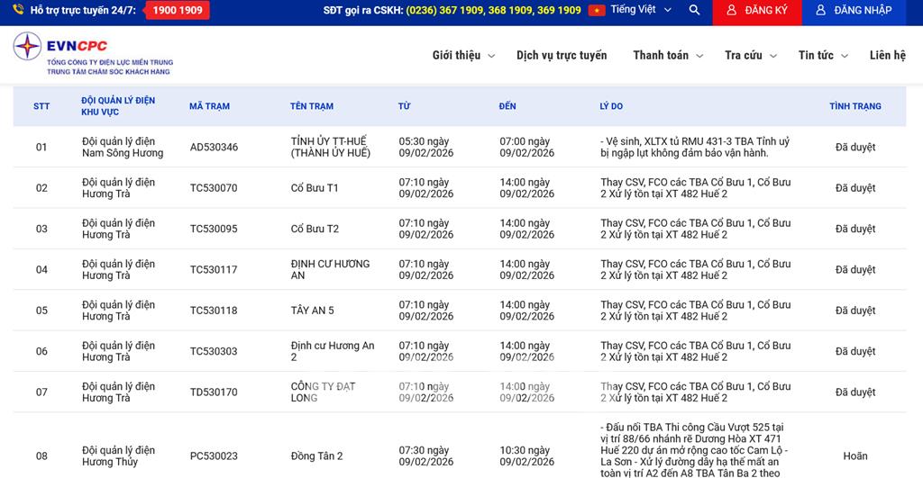 | 7 | Đội quản lý điện Hương Trà | TD530170 | CÔNG TY ĐẠT LONG | 07:10 09/02/2026 | 14:00 09/02/2026 | Thay CSV, FCO các TBA Cổ Bưu 1, Cổ Bưu 2Xử lý tồn tại XT 482 Huế 2 | Đã duyệt |