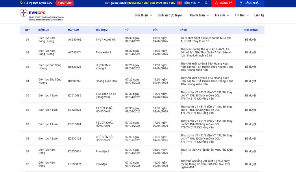 | 10 | Điện lực Nam Đông | FC530032 | Phú Mậu | 07:30 09/04/2026 | 11:00 09/04/2026 | Thay thế AB tổng, AB xuất tuyến A, thay thế hệ thống đo đếm TBA Phú Mậu 2 và ngâm MBA | Đã duyệt |