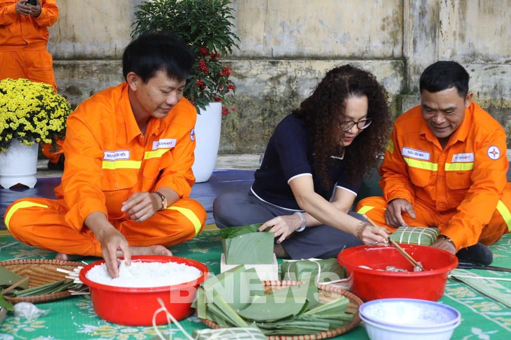 Phóng viên cùng tham gia gói bánh trưng với công nhân truyền tải điện Đắk Lắk. Ảnh: Mai Phương/Vnanet.vn/Bnews.vn