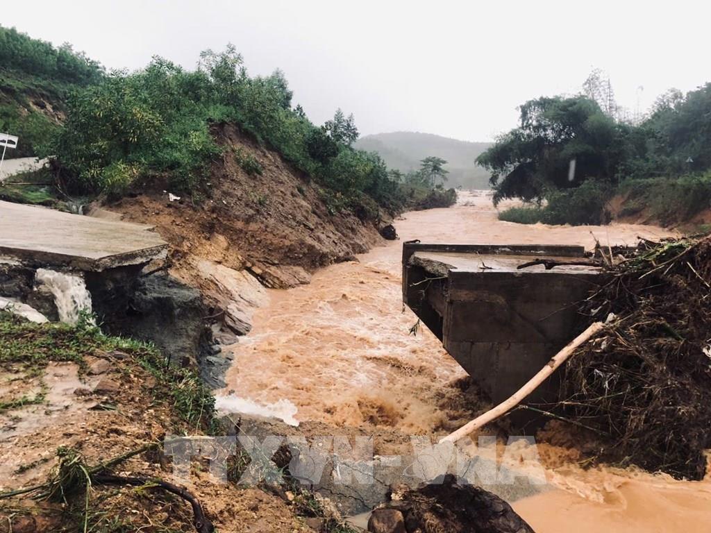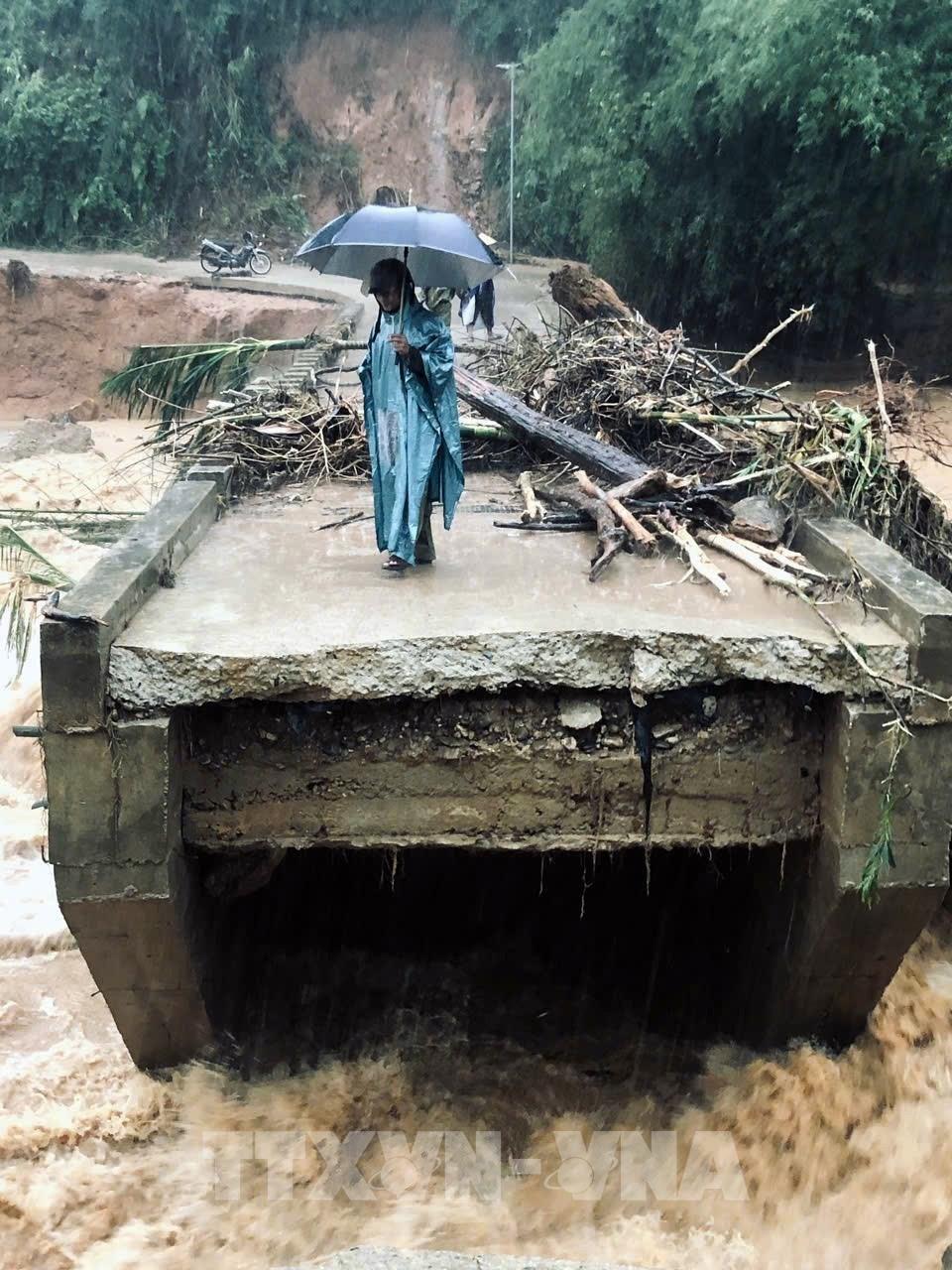 Cầu Nước Bao xã Sơn Hà (Quảng Ngãi) bị gãy 1 nhịp dài khoảng 3m. Cầu Nước Bao là con đường duy nhất để lên 2 thôn Măng Nà, Nước Bôi. Việc cầu bị gãy đã làm hơn 280 hộ của 2 thôn bị chia cắt, cô lập. Ảnh: TTXVN phát