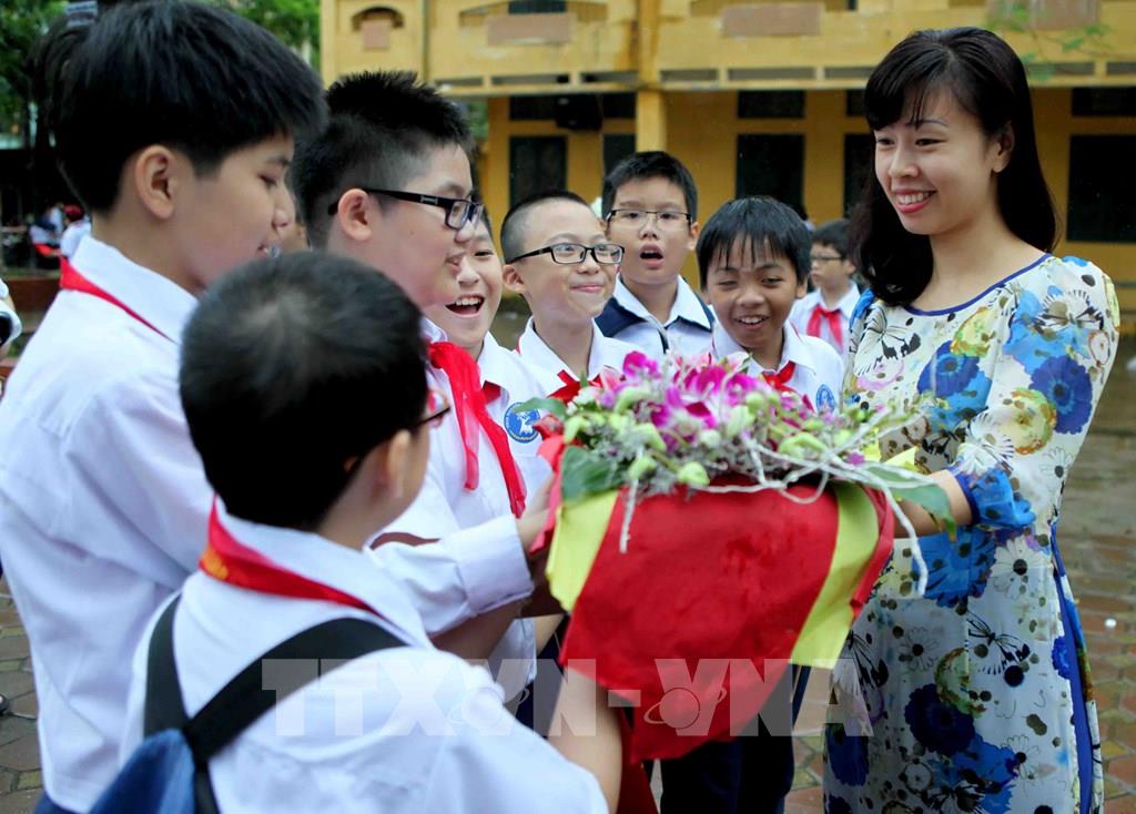 Học sinh trường Trung học cơ sở Nguyễn Trường Tộ, Hà Nội chúc mừng cô giáo nhân Ngày Nhà giáo Việt Nam. Ảnh tư liệu: Quý Trung - TTXVN