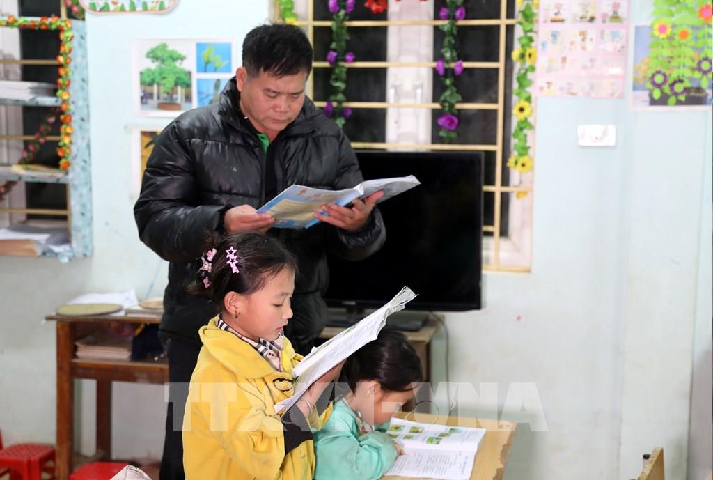 Không chỉ là nơi truyền đạt tri thức, lớp học miễn phí của thầy Lương Thanh Hưng còn là chỗ dựa tinh thần cho các em học sinh ở Piêng Vai. Ảnh: Văn Tý-TTXVN