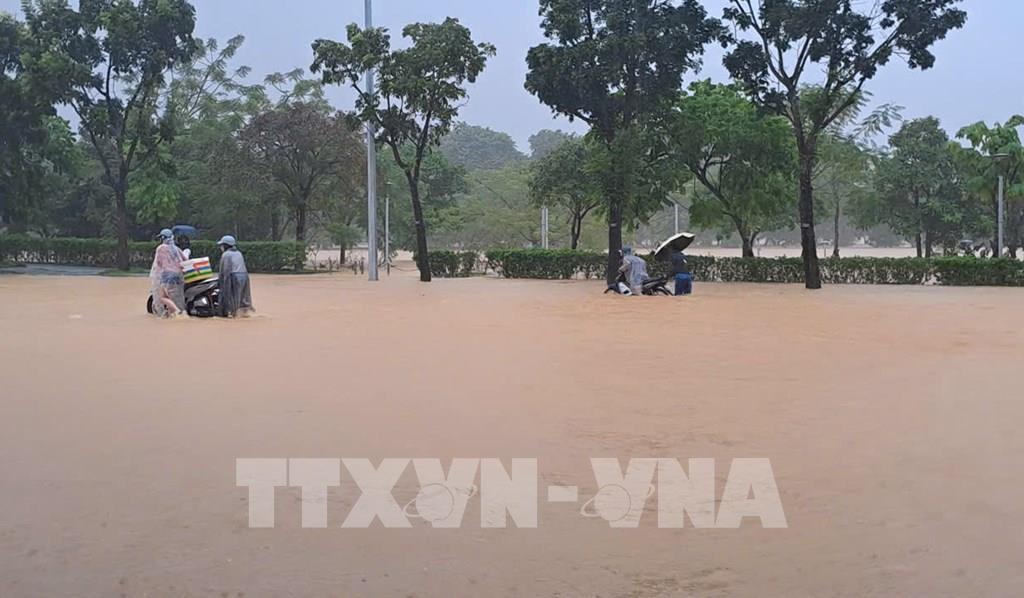 Khu vực vòng xuyến phía Nam cầu Dã Viên ở bờ Nam sông Hương, thành phố Huế tái ngập lụt do lũ lên lại. Ảnh: Nguyên Lý - TTXVN