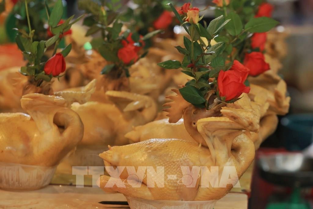 Gà ngậm hoa hồng là mặt hàng được mua nhiều nhất trong lễ cúng Rằm. Ảnh tư liệu: Tuấn Anh - TTXVN