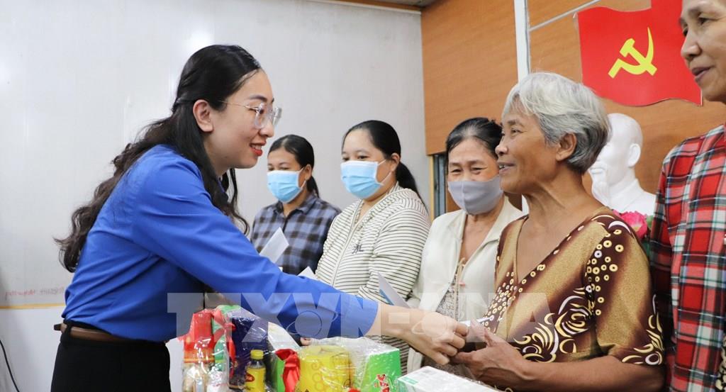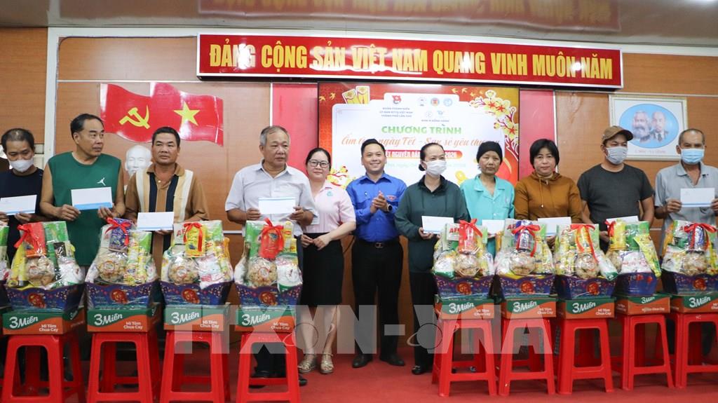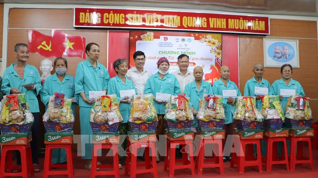 Tặng quà tết cho bệnh nhân có hoàn cảnh khó khăn đang điều trị tại Bệnh viện Ung bướu thành phố Cần Thơ. Ảnh: Hồng Thái - TTXVN
