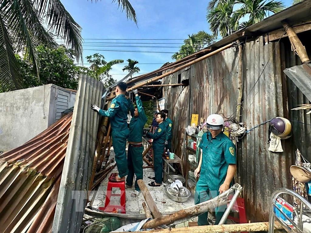 Lực lượng chức năng ra quân hỗ trợ và khắc phục hậu quả thiên tai. Ảnh: TTXVN phát