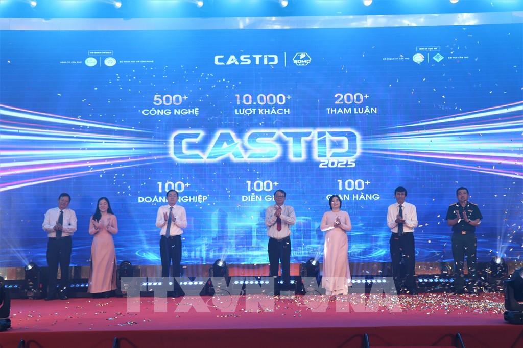 Các đại biểu thực hiện nghi thức phát động Tuần lễ khoa học công nghệ, Đổi mới sáng tạo và Chuyển đổi số TP. Cần Thơ năm 2025. Ảnh: Thu Hiền - TTXVN