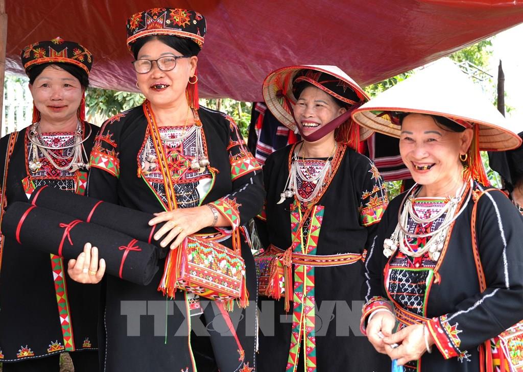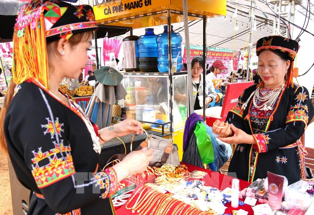 Phụ nữ dân tộc lựa chọn trang phục, phụ kiện truyền thống tại Lễ hội Chợ Thụt, xã Phù Lưu (Tuyên Quang). Ảnh: Minh Tâm - TTXVN
