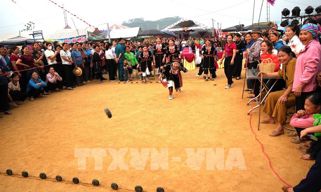 Bà con các dân tộc và du khách hào hứng tham gia trò chơi dân gian đánh pam tại Lễ hội Chợ Thụt xã Phù Lưu (tỉnh Tuyên Quang). Ảnh: Minh Tâm - TTXVN