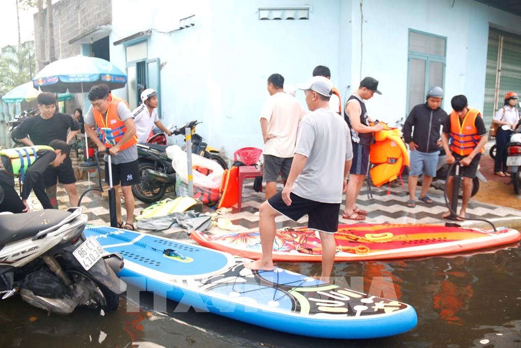 Thanh niên địa phương bơm xuồng phao đến hỗ trợ người dân di chuyển ra khỏi vùng ngập sâu. Ảnh: Nguyễn Thanh - TTXVN  Người dân di chuyển đồ đạc tại khu vực ngập sâu đến nơi ở khác. Ảnh: Nguyễn Thanh - TTXVN