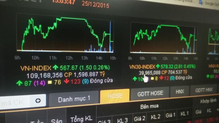 Kết thúc phiên giao dịch, chỉ số VN-Index tăng nhẹ 1,5 điểm (0,26%) lên 567,67 điểm. Toàn sàn có 87 mã tăng, 123 mã giảm và 98 mã đứng giá. Tổng khối lượng giao dịch đạt hơn 109 triệu cổ phiếu, tương ứng giá trị giao dịch trên 1.596,89 tỷ đồng, trong đó, giao dịch thỏa thuận là hơn 432 tỷ đồng.