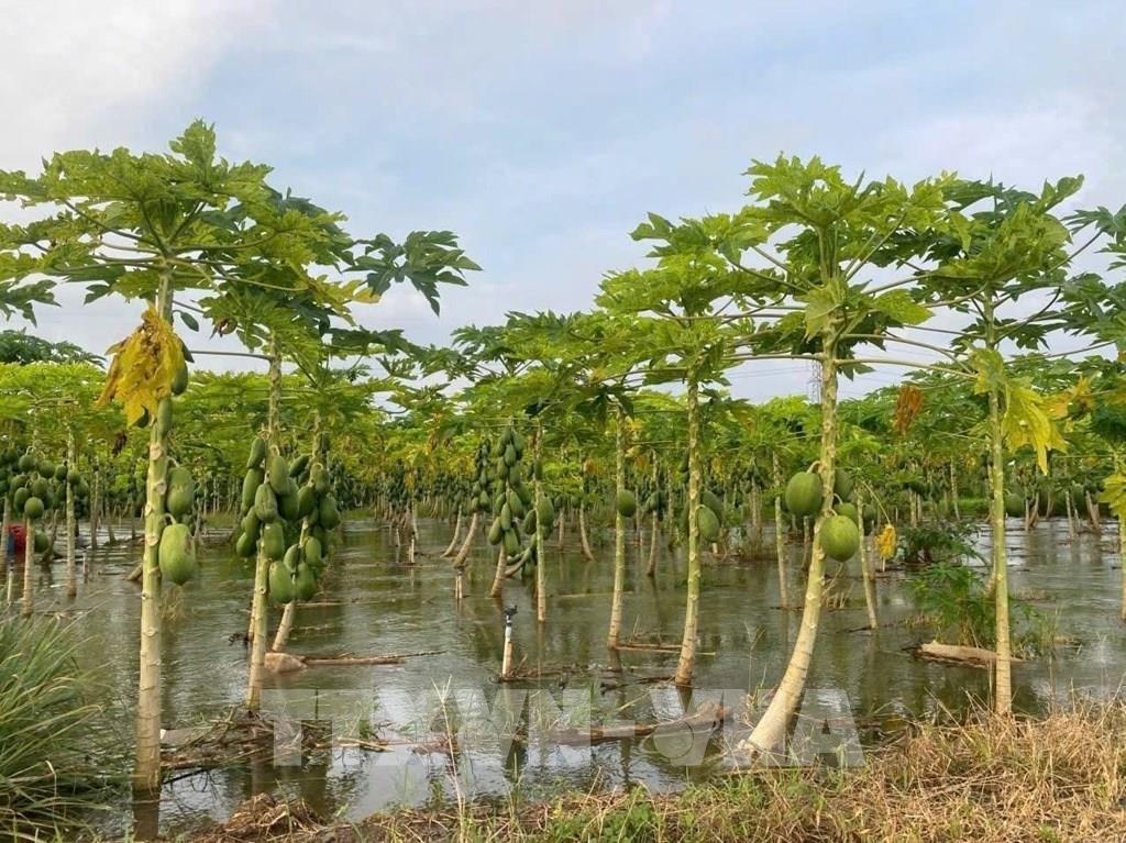 Vườn đu đủ của một hộ dân ấp Tân Rú, xã Hồ Tràm ngâm trong nước đã 4 ngày từ ngày 12-15/11. Ảnh: Hoàng Nhị - TTXVN