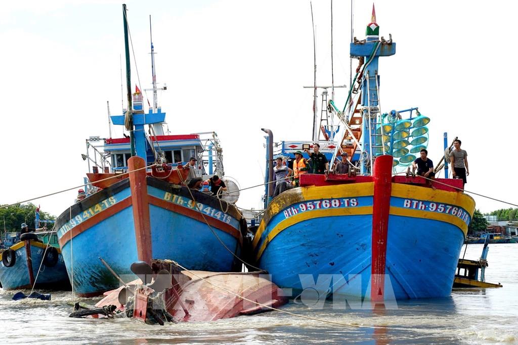 Đồn biên phòng Thanh Hải cùng lực lượng hỗ trợ dùng thêm nhiều tàu lớn để giữ không cho nước cuốn trôi tàu cá BTh 8077 TS. Ảnh: Nguyễn Thanh - TTXVN