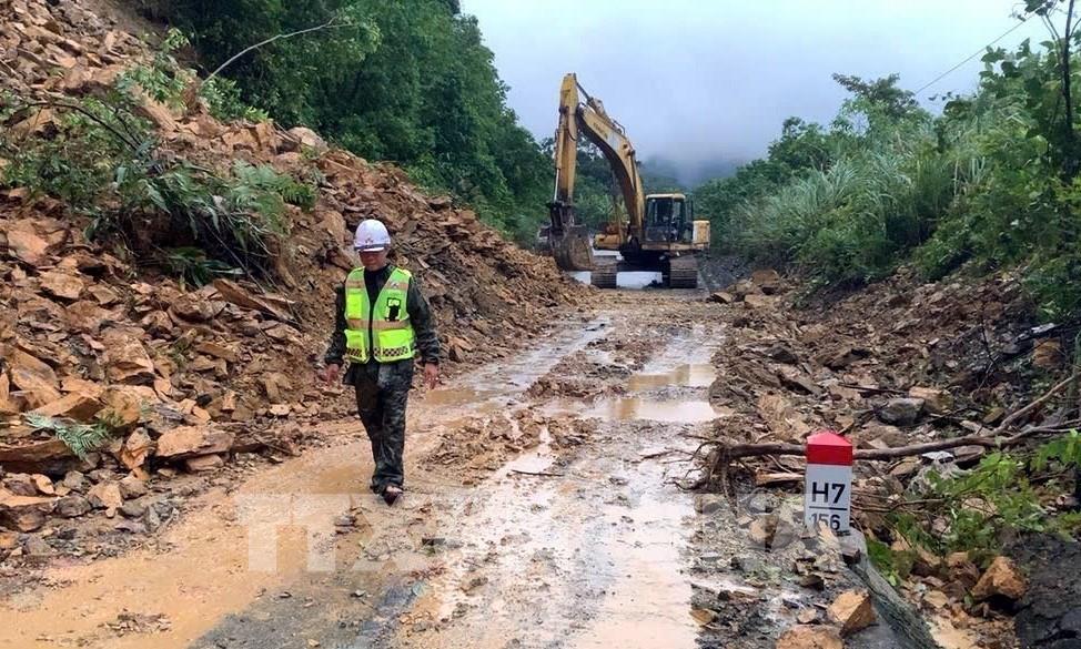 Nhân lực và phương tiện được huy động để thông đường tại các điểm sạt lở trên đường Hồ Chí Minh nhanh Tây đoạn qua địa bàn tỉnh Quảng Trị. Ảnh: TTXVN phát