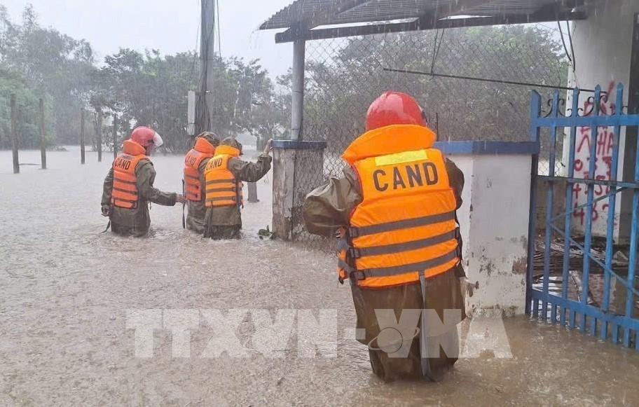 Lực lượng Công an có mặt tại các vị trí xung yếu, sẵn sàng ứng phó mưa lũ. Ảnh: TTXVN phát
