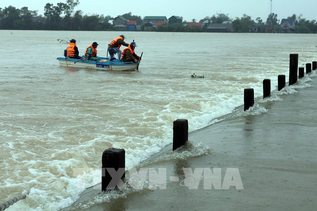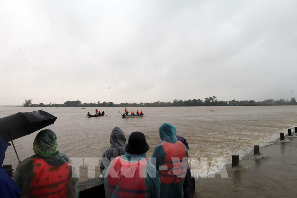 Lực lượng chức năng nỗ lực tìm kiếm một nạn nhân mất tích do lật ghe trong dòng nước lũ tại xã Đan Điền, thành phố Huế. Ảnh: Đỗ Trưởng – TTXVN