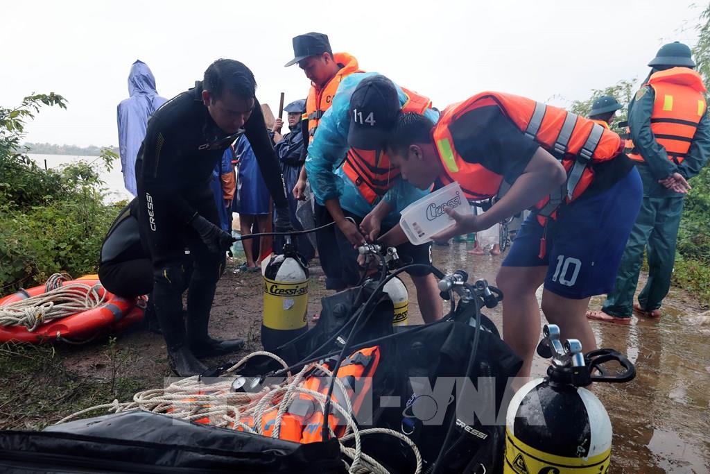 Các thợ lặn chuẩn bị để xuống nước tìm kiếm người mất tích tại khu vực đập tràn nơi xảy ra vụ đuối nước tại xã Đan Điền, thành phố Huế. Ảnh: Đỗ Trưởng – TTXVN