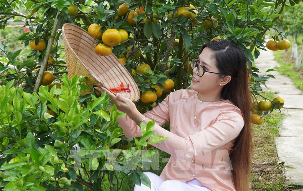 Du khách chụp ảnh check-in tại Điểm tham quan vườn quýt hồng Bá Chuốt (xã Lai Vung, tỉnh Đồng Tháp). Ảnh: Nhựt An - TTXVN