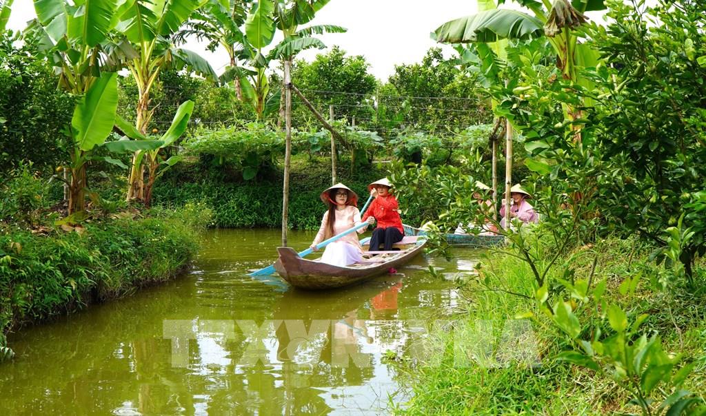 Du khách tham quan, trải nghiệm bơi xuồng tại Vườn quýt hồng Bá Chuốt (xã Lai Vung, tỉnh Đồng Tháp). Ảnh: Nhựt An - TTXVN