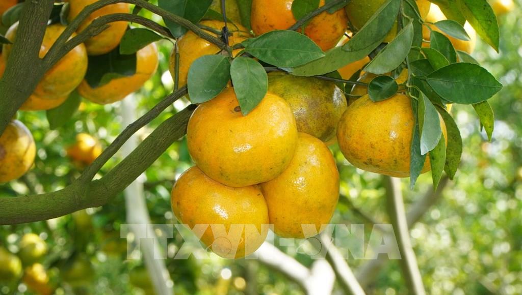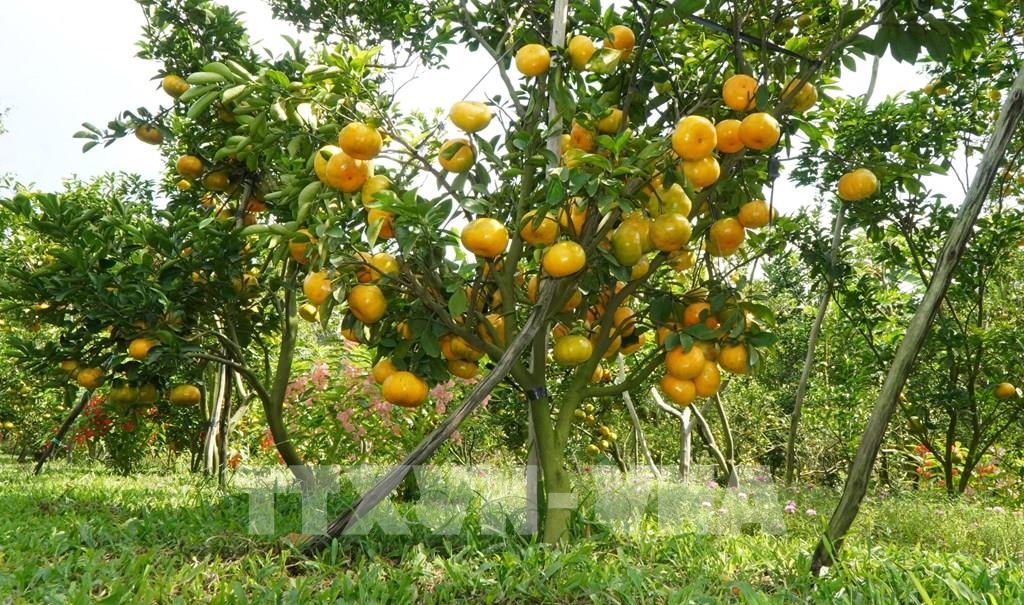 Điểm tham quan vườn quýt hồng Hai Kiệt (xã Hòa Long, tỉnh Đồng Tháp) rộng 5.000m2, quả sai trĩu cành và chín vàng. Ảnh: Nhựt An - TTXVN