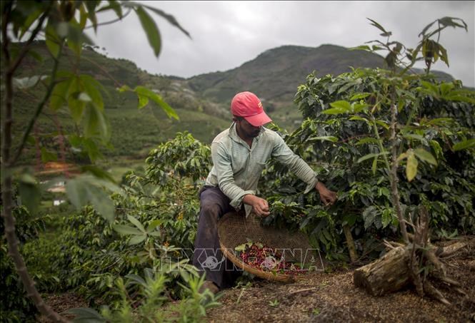 Nông dân thu hoạch hạt cà phê tại một nông trại ở Forquilha do Rio, Espirito Santo, Brazil. Ảnh: AFP/TTXVN