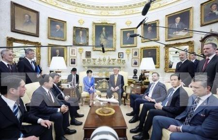 Tổng thống Mỹ Donald Trump (phải, phía xa) hội đàm với Thủ tướng Nhật Bản Sanae Takaichi (trái, phía xa) ở Washington DC., ngày 19/3/2026. Ảnh: Kyodo/TTXVN